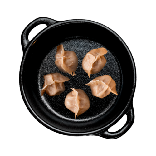 Ravioli brasati artigianali cinesi di farina di grano bianca e integrale con spolverata di sesamo, ripieni di pollo, carote, mais, cipollotto e zenzero – Cottura consigliata brasati